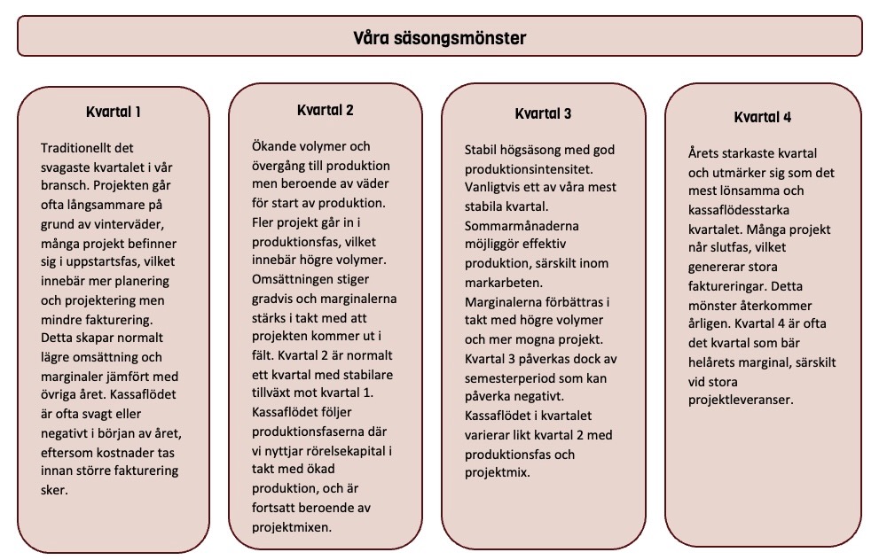 Netels verksamhet följer tydliga och återkommande säsongsmönster, kopplade till projektlivscykler, kundernas investeringsplaner och väderförutsättningar. Dessa mönster påverkar både volymer, marginaler och kassaflöden. Med hänsyn till hur vår projektmix ser ut i år ser vi en något lägre aktivitet under inledningen av första kvartalet än föregående år. Detta beror dels på att vi har många projekt i uppstartsfas med förberedande arbeten som design och planering , dels på vintervädret som gör att vi fortsatt avvaktar med att starta upp viss produktion. Vi har förväntade större produktionsvolymer under främst andra halvåret.